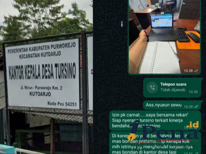 Purworejo | 1 pena.id — Dugaan pelimpahan tugas bendahara desa kepada pihak yang tidak berwenang mencuat di Desa Tursino, Kecamatan Kutoarjo, Kabupaten Purworejo. Informasi tersebut mencuat ke publik setelah redaksi menerima pesan dan dokumentasi berupa percakapan WhatsApp serta foto aktivitas di lingkungan kantor desa, Senin (15/12/2025).