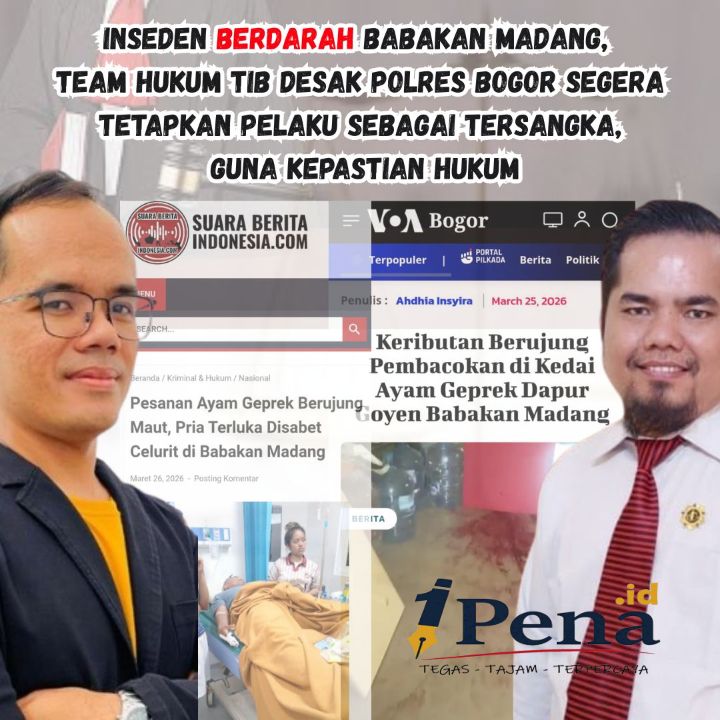 Bogor|1pena.id-Insiden berdarah yang terjadi di sebuah kedai ayam geprek di kawasan Babakan Madang, Kabupaten Bogor, pada Rabu (23/3/2026), keluraga korban secara resmi memberikan kuasa kepada Kantor Hukum Timur Indonesia Bersatu (TIB) guna mendapatkan pendampingan dan keadilan hukum. Terdiri dari Team Hukum Adv. Hermanto, S.Pd.K., S.H., CPS., CLS., CNS., CHL., dan Atep Linda Ramdhani., S.H.