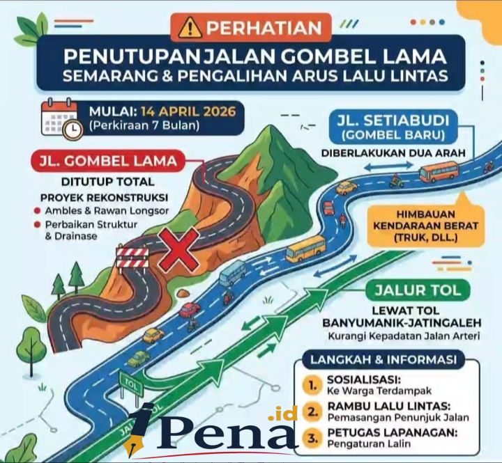 Semarang | 1pena.id — Penutupan total Jalan Gombel Lama mulai 14 April 2026 menjadi langkah strategis yang perlu dipahami masyarakat. Kebijakan ini bukan sekadar proyek perbaikan biasa, melainkan upaya serius untuk menjaga keselamatan pengguna jalan.