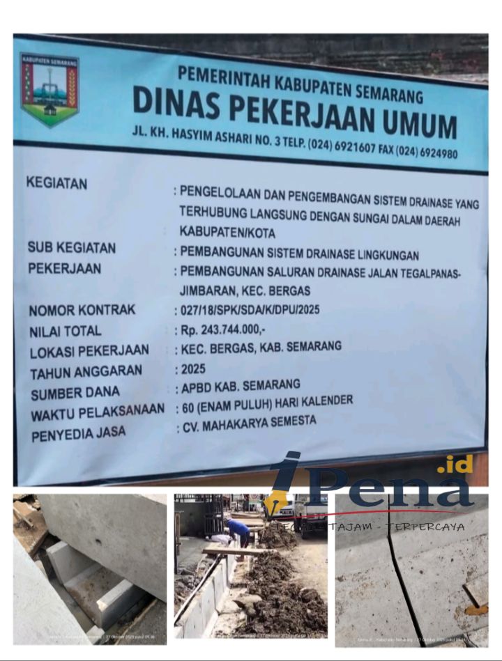 Semarang,1pena.id – Proyek pembangunan saluran drainase di Jalan Tegalpanas–Jimbaran, Kecamatan Bergas, kembali menjadi sorotan publik. Proyek yang bersumber dari APBD Kabupaten Semarang Tahun Anggaran 2025 itu diduga tidak memenuhi standar operasional pelaksanaan (SOP) dan mengabaikan aspek penting Keselamatan dan Kesehatan Kerja (K3).